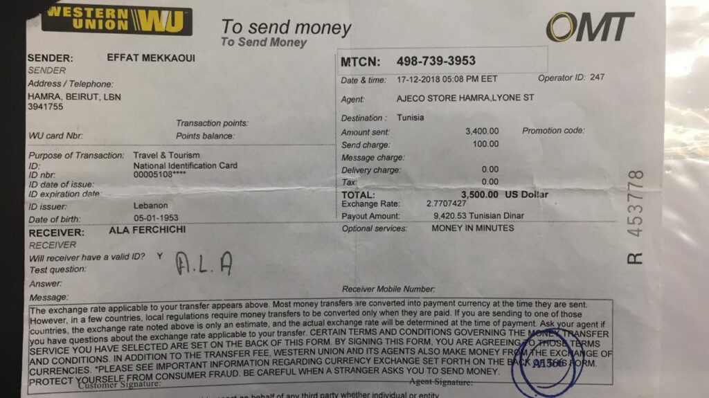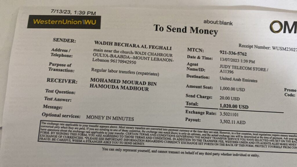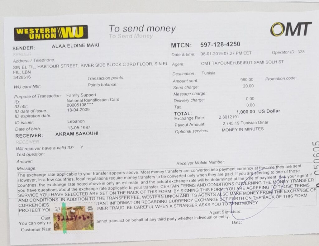 ALAA ELDINE MAKI لـ Akrem Mag — 1,100 دولار — من بيروت لدبي — يبعث الفلوس لروحو عبر Western Union بدل تحويل بنكي.